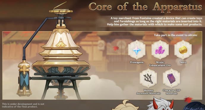 যন্ত্রপাতি ইভেন্টের মূল অংশ হিসাবে চ্যালেঞ্জগুলি সম্পূর্ণ করে আপনি প্রাইমোজেমস, হিরোর বুদ্ধি, অস্ত্র অ্যাসেনশন উপকরণ, মোরা, মিস্টিক বর্ধন আকরিক এবং অন্যান্য অপ্রচলিত পুরষ্কার উপার্জন করতে পারেন.