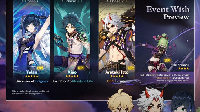ফাঁসকারীরা ঠিক লক্ষ্য ছিল. ইয়েলান সংস্করণ 2 এর প্রথমার্ধের জন্য বৈশিষ্ট্যযুক্ত পাঁচতারা.7. আমাদের প্রিয় জেনশিন শর্ট কিং, জিয়াও তার সাথে আবারও পুনরায় চালু হবে. এদিকে, দ্বিতীয়ার্ধে আরাতাকি ইট্টোর ব্যানারে তিনটি চার-তারকাগুলির একজন হিসাবে কুকি শিনোবু আত্মপ্রকাশ করবেন.