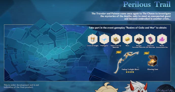 নতুন আর্চন কোয়েস্ট অধ্যায়ের সাথে সম্পর্কযুক্ত “বিপজ্জনক ট্রেইল”, এটি সবচেয়ে বড় ঘটনা জেনশিন প্রভাব 2.7. এটিতে সর্পিল অ্যাবিসের সেটআপের অনুরূপ অন্ধকূপগুলি অন্তর্ভুক্ত রয়েছে, যেখানে চরিত্রগুলি যুদ্ধের চ্যালেঞ্জগুলি সম্পূর্ণ করতে দলে বিভক্ত. খেলোয়াড়রা প্রতিটি পর্যায়ের সাথে সম্পর্কিত বাফস এবং ডিবফসের ভিত্তিতে সামঞ্জস্য করবেন বলে আশা করা হচ্ছে.