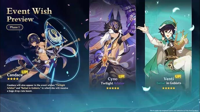 - ভেন্টি (গব্লেটস ব্যানারে ব্যালাদ – প্রথম পর্ব): 5-তারকা অ্যানিমো চরিত্রটি ফিরিয়ে দেওয়া যিনি একটি ধনুক ব্যবহার করেন এবং এটি একটি সমর্থন এবং সাব ডিপিএস ভূমিকাতে সবচেয়ে ভাল ব্যবহৃত হয়.
