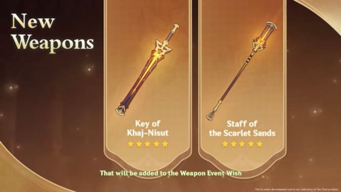 এছাড়াও 3 এ জেনশিন ইমপ্যাক্টে পাঁচটি নতুন অস্ত্র আসছে.1, নতুন সঙ্গে স্কারলেট স্যান্ডস পোলার্মের 5-তারকা কর্মীরা এবং খাজ-নিসুত তরোয়াল এর 5-তারকা কী যথাক্রমে পরবর্তী এপিটোম ইনভোকেশন অস্ত্র ব্যানারগুলির প্রথম ধাপ এবং দ্বিতীয় ধাপে বৈশিষ্ট্যযুক্ত.