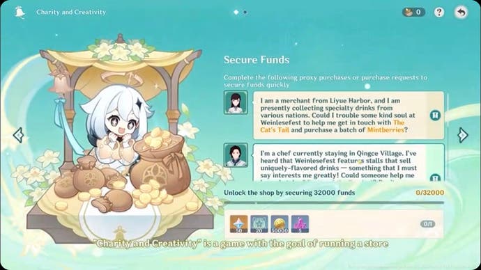 দাতব্য এবং সৃজনশীলতা একটি সম্পূর্ণ ভিন্ন অভিজ্ঞতা, আপনাকে একটি দোকান চালানোর সাথে টাস্ক করে! আসলে দোকানটি পেতে এবং চলমান করার জন্য আপনাকে কিছু ছোট অনুসন্ধান শেষ করতে হবে, তারপরে যখন আপনার দোকানটি খোলা থাকে, আপনাকে আপনার তহবিলগুলি তিনটি পৃথক অগ্রাধিকারে পরিচালনা করতে হবে: পণ্যের গুণমান, ব্যবসায়ের দক্ষতা এবং সামগ্রিক পরিষেবা. এই তিনটি স্লাইডার ঠিক না হওয়া পর্যন্ত সামঞ্জস্য করার ফলে আপনি আরও ‘ব্যবসায়িক উপার্জন’ উপার্জন করবেন. আপনাকে সাহায্য করার জন্য আপনি সহায়ক ভাড়া নিতে সক্ষম হবেন.
