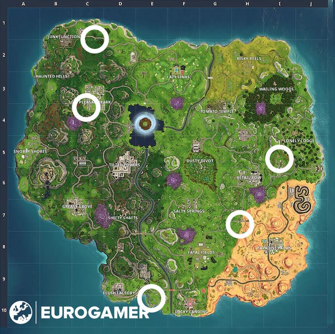 যেখানে ক্লাউন বোর্ডের অবস্থানগুলি ফোর্টনাইট জুড়ে বিন্দুযুক্ত.