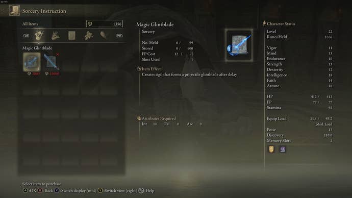 যখন তার কথোপকথনটি শেষ হয়ে যায়, তখন আপনি তার কাছ থেকে 3000 রুনের জন্য ম্যাজিক গ্লিন্টব্লেড স্পেল এবং 10,000 টি রুনের জন্য কেরিয়ান গ্রেটসওয়ার্ড স্পেল কিনতে পারেন.